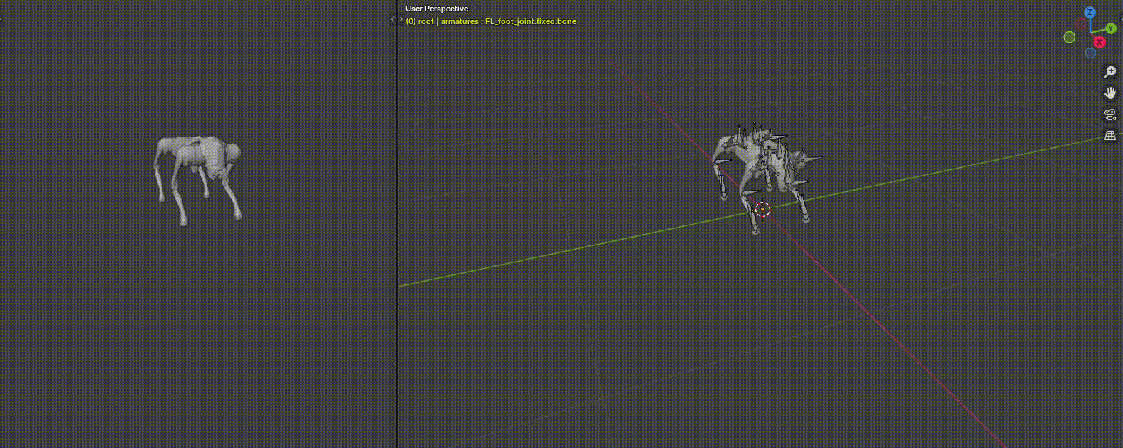 With RL, I was also able to train some highly dynamic behaviors like a backflip on the Go2. I use blender to first create the reference trajectory to track. With a few keyframes, Blender is automatically able to interpolate what happens between. It also perform Inverse Kinematics automatically in case one wants to move just the end effector position over time.