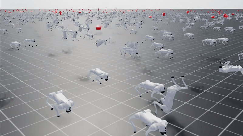 To speed training up, I add in a wrench assist which will apply a force and torque to keep up with the reference at first. Over time, it will decay to no assist and the policy takes over fully. The red arrows you see appear sometimes is the wrench assist magnitude.